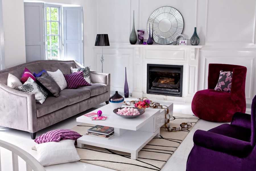 Фиолетовый и зеленый выступают в качестве дополнительных цветов, не перегружая общее пространство комнаты.