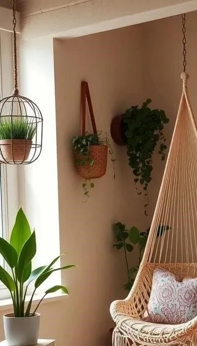 Описание: Подвесное кресло, установленное в углу комнаты. Плюсы: Оригинальность, комфорт, ощущение полета. Минусы: Требует прочного потолка.