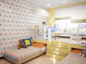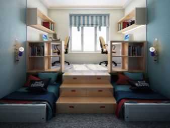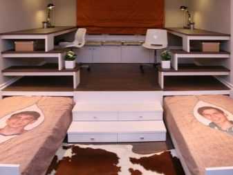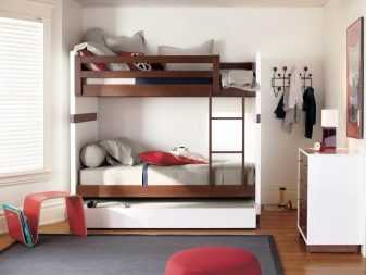 Двухъярусные выдвижные кровати для детей выпускаются не только с параллельным расположением спальных мест, но и с перпендикулярной установкой нижней части. Нижний ярус в такой конструкции становится более удобным, так как появляется свободное пространство сверху. Для экономии пространства такую модель лучше установить на углу комнаты. Помимо двухъярусных вариантов производители выпускают модели, предназначенные для троих ребят. В таких моделях верхний ярус может быть как открытым, так и закрытым. В сложенном состоянии такая модель похожа на обычную тумбу, все ярусы скрыты внутри.