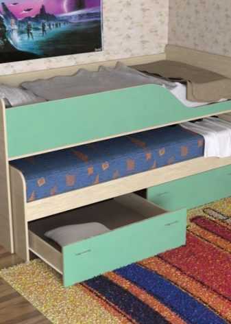 Некоторые модели выдвижных вариантов для детей оснащаются дополнительными ящиками. Вариант с ящиком очень удобен в использовании, потому что позволяет разместить любые личные вещи ребёнка, будь то игрушки, постельное бельё или одежда. Располагаются они под нижней частью конструкции и снабжены выкатным или выдвижным механизмом, как и спальное место. Трансформация осуществляется с помощью колёсиков, прикреплённых к боковым сторонам. Они двигаются либо по направляющим, либо по полу.