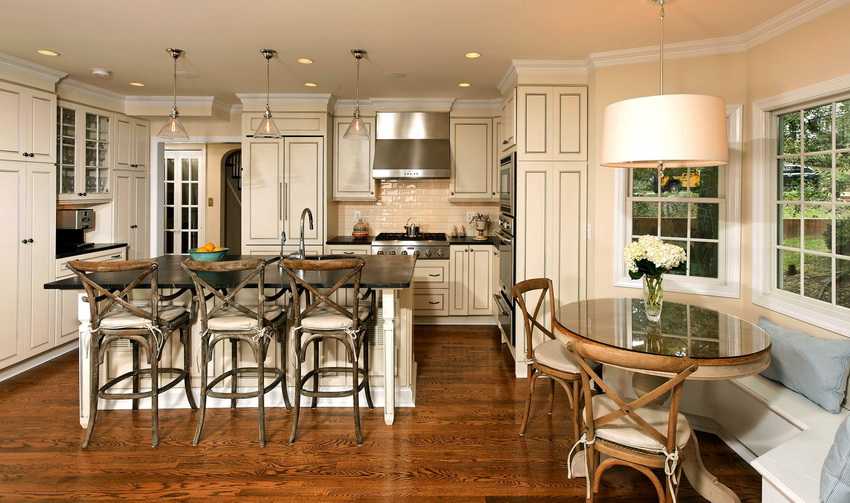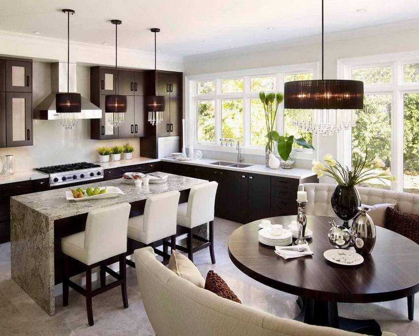 Существуют некоторые моменты, которые нельзя упускать из вида при обустройстве кухни-столовой. Дизайнеры дают следующие советы: