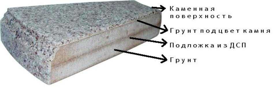 Это самая дешевая и оттого наиболее распространенная разновидность синтетического камня. Данный материал в жидком виде распределяется по основе из ДСП или MDF слоем в 0,3-1,5 см. Его составляют декоративный цветной заполнитель (дробленый камень) и полимерное вяжущее вещество.