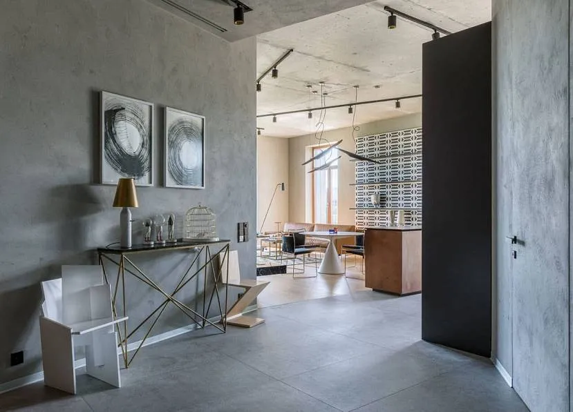 Ценителям лаконичных образов интерьера однозначно понравится облик прихожей, выдержанной в серых тонах. Присущий декоративному бетону серый цвет органично будет смотреться не только на напольном покрытии, но и при отделке стен. Гармоничным дополнением станет установка пенала или шкафа с зеркальными фасадами, излучающими холодный блеск и отражающими окружающее пространство. Для создания целостного сюжета на картине интерьера прихожей актуально выбрать типажный декор для нанесения витражного рисунка на мебельное зеркало, стеклянные вставки межкомнатных дверей или натяжное полотно на потолке.