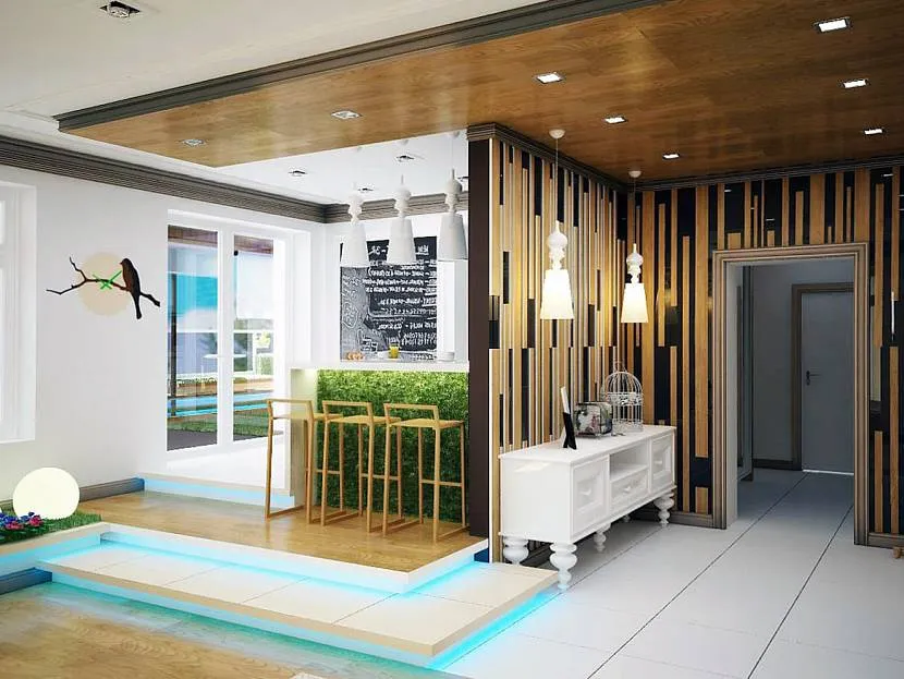 - Простота зонирования. Достаточно будет переходов цвета, смены фактуры или темных вставок, чтобы разделить участки комнаты разного назначения. Не понадобится использовать полноценные перегородки.