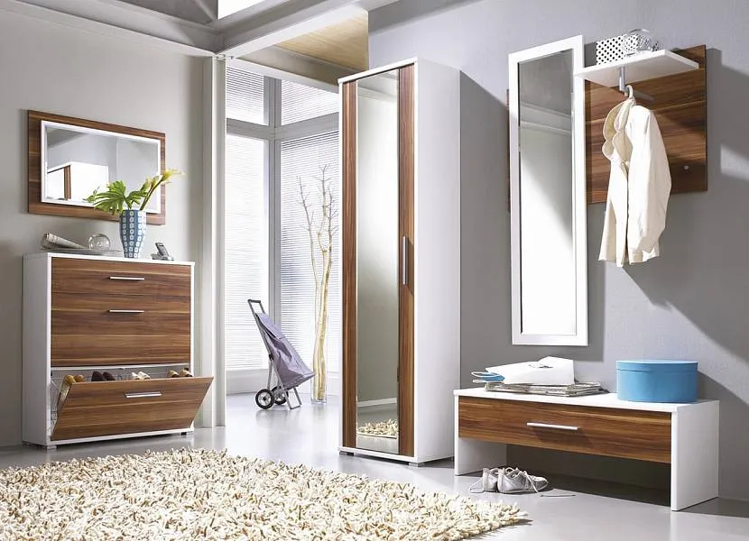 Находкой станет модульная мебель. Модульные системы позволяют максимально эргономично организовать пространство. Например, набор мебели, представленный на фото ниже можно использовать полностью, или купить только шкаф, вешалку и полку для обуви. Если позволяет площадь комнаты стоит повесить зеркало, разместив под ним узкую тумбу. Варианты набора подбираются под конкретные возможности.