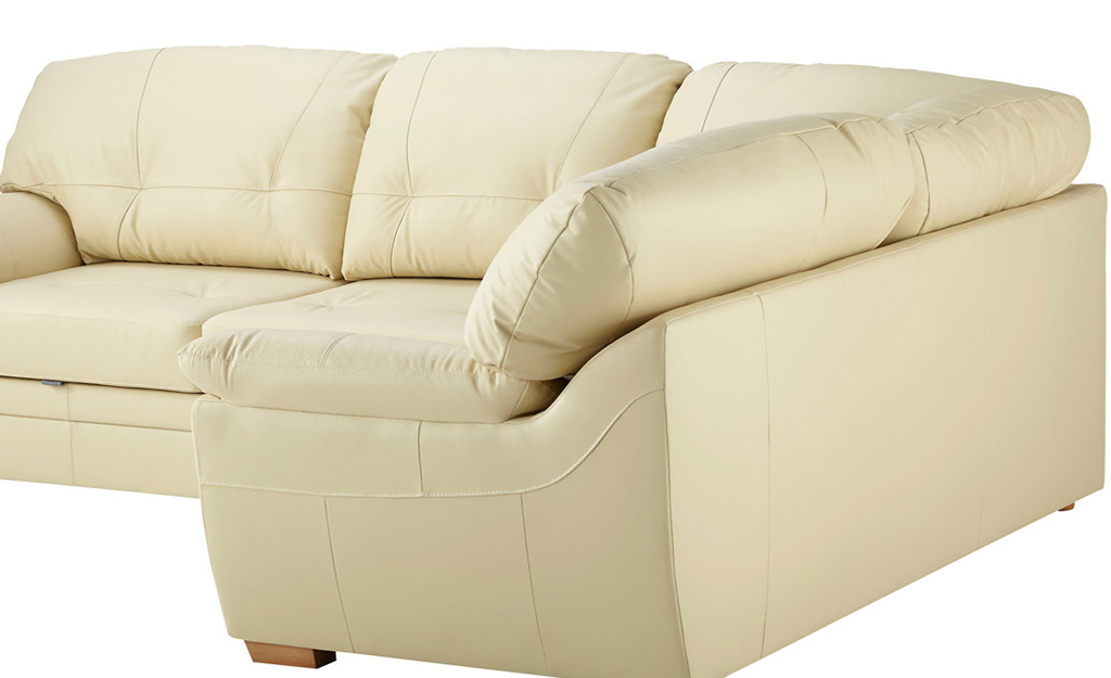 Угловой диван с округлыми формами и с наполнителем из пенополиуретана. Благодаря обивке из искусственной кожи он не впитывает влагу и с легкостью справляется с загрязнениями. |