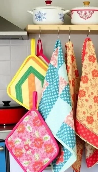 На кухне текстиль должен быть практичным и функциональным. Прихватки и полотенца, сшитые своими руками, защитят ваши руки от ожогов и помогут поддерживать чистоту. Скатерть из яркой ткани создаст праздничное настроение.