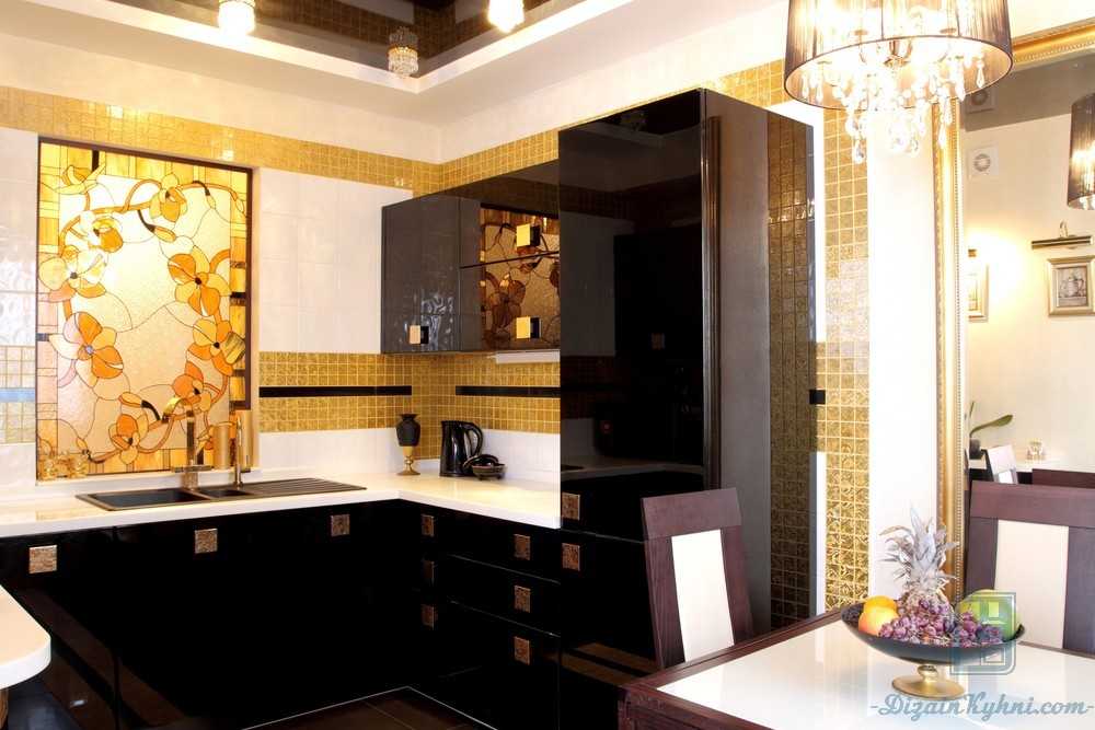 Оригинальный способ выделить кухню, сделать её интерьер нетривиальным — установить чёрный потолок. Глянцевая навесная или натяжная конструкция будет отражать свет. Чтобы поверхность потолка не выглядела мрачной, рекомендуется обрамить его белыми плинтусами. Дизайн подобной кухни в чёрно-белых тонах можно посмотреть на фото.