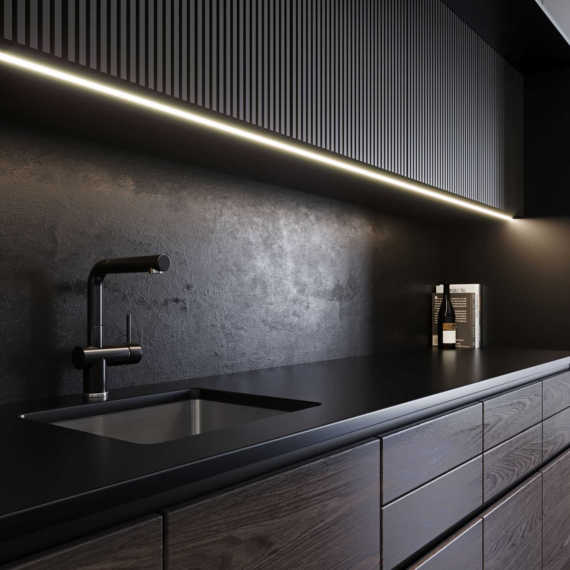 Даже если вы хотите сделать темный гарнитур, в случае со столешницей возможны вариации. Самый очевидный ход — оформить ее в тон кухонной стенки.
