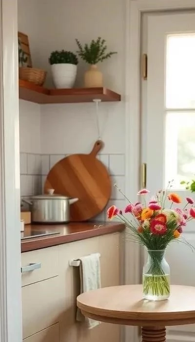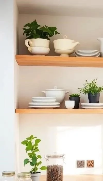 Открытые полки – отличный способ добавить кухне легкости и воздушности. Их можно сделать из дерева, металла или стекла. Разместите на полках красивую посуду, специи, растения или декоративные предметы. Материалы: доски/металл/стекло, крепеж, дрель, шуруповерт.
