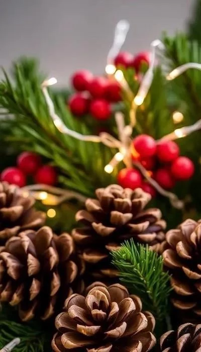 Создайте новогодние композиции из шишек, веток, бусин и других декоративных элементов. Композицию можно разместить на столе, полке или подоконнике. Используйте красивую вазу или поднос. Пример: положите на поднос несколько шишек, веток ели и бусин. Добавьте маленькую елочную игрушку и свечу.