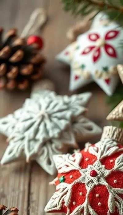 Создайте уникальные елочные игрушки из ткани или бумаги. Из ткани можно сшить маленькие мешочки, наполненные ватой или синтепоном, и украсить их вышивкой, бисером или пайетками. Из бумаги можно вырезать снежинки, звезды, ангелочков и другие фигурки. Используйте яркие цвета и блестки для создания праздничного настроения. Пример: вырежьте из фетра два одинаковых сердечка, сшейте их вместе, оставив небольшое отверстие, наполните ватой и зашейте. Украсьте сердечко бусинами и ленточкой.