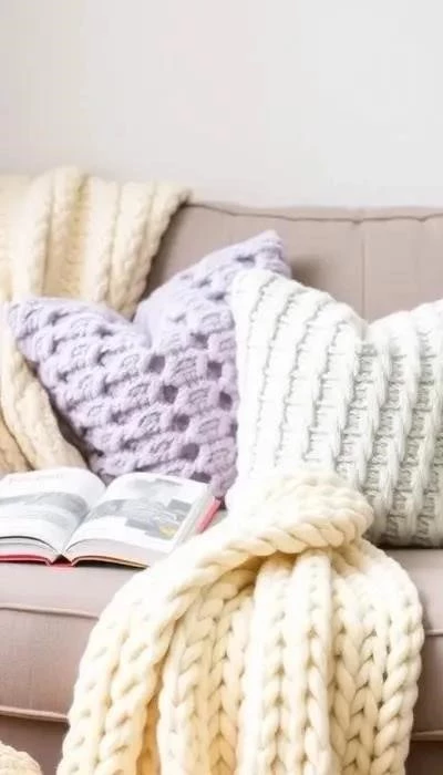 Вязаные подушки – один из самых простых и эффектных способов преобразить интерьер. Можно связать подушки разных форм (квадратные, круглые, прямоугольные), с разными узорами (косы, араны, жаккард) и техниками (вязание спицами, вязание крючком). Особенно актуальны подушки с объемными узорами и кисточками.
