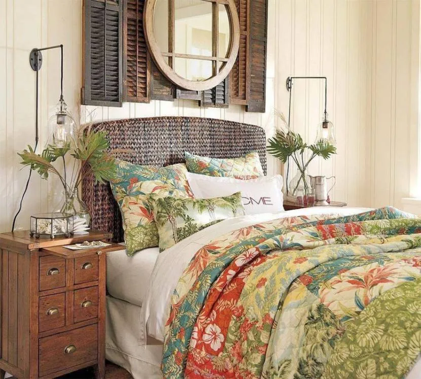 Концепцию оценят люди, побывавшие в тропиках: оформление призвано воспроизвести атмосферу роскошного тропического курорта. Дизайн во многом напоминает эко-стиль, но имеет и свои характерные признаки. Главная особенность спальни с тропическим колоритом – добавление в обстановку этнических элементов.