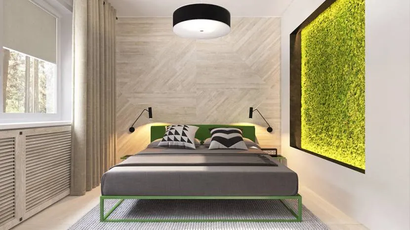 Зеленая палитра включает яркие тона, напоминающие о сочной тропической зелени, бирюзовых водопадах и морском прибое. В дизайн спальни с зеленой кроватью можно смело добавлять и зеленые стены; они станут дополнительным источником позитивного настроения. Усилить впечатление от дизайна можно с помощью следующих приемов: