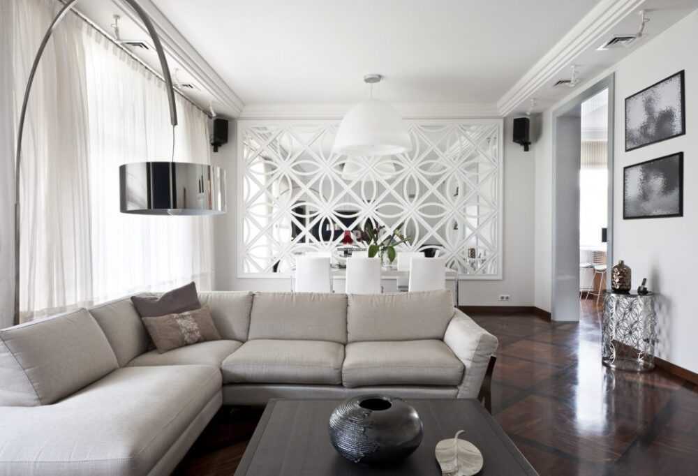 В большой гостиной смелым решением будет стена, полностью состоящая из ромбовидных зеркал. Рядом с такой перегородкой гармонично смотрится многоуровневый потолок с дополнительной подсветкой. А венцом оформления будет громадная хрустальная люстра посередине комнаты.