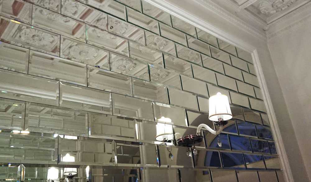 Поэтому наиболее разумным решением будет заказать изготовление зеркальной плитки в компании, занимающейся стеклом и зеркалами. Там части панно вырежут по вашему эскизу и размерам, обработают края, пронумеруют детали, и тогда вы сможете поклеить их на свою стену.