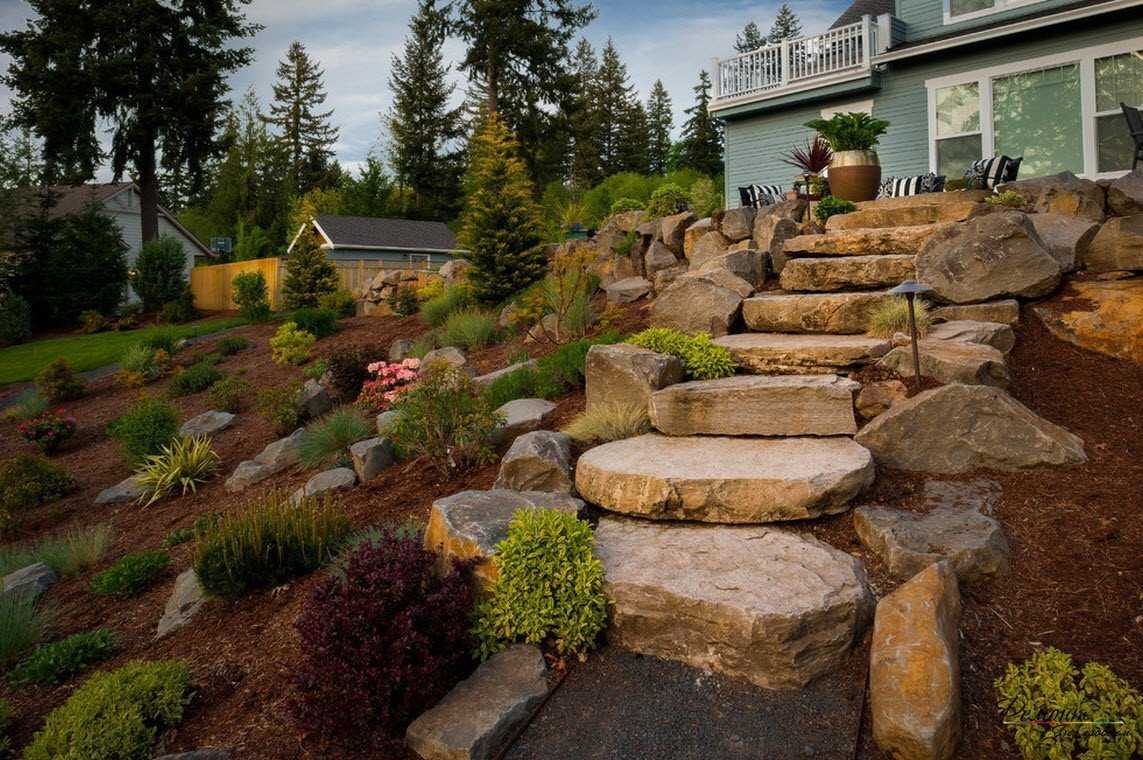 Если для создания композиций использовать разных по типу и происхождению материал, то можно получить оригинальное оформление. Для композиции могут пригодится булыжники крупной фракции, колоритный гранит, морскую гальку, отшлифованную натуральным способом. Посредством морской гальки можно оформить извилистую дорожку, которая будет напоминать змейку, убегающую по зеленому газону. Она может упираться в одиночный валун, вблизи которого можно установить светлую деревянную лавочку, на которой будет приятно провести время за беседой.