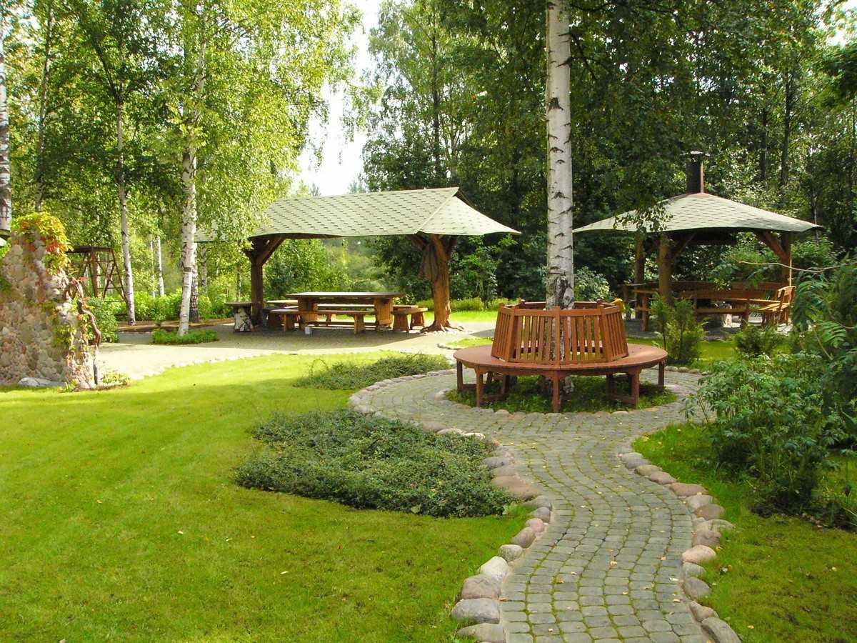 - Не лишним будет сооружение площадки с функцией очага, на которой размещают барбекю или мангал, деревянные массивные столы и лавки и место под дрова. Такая площадка может быть круглой, квадратной или произвольной формы. Можно выложить в центре площадки место для живого костра, задекорировав его камнями. Это может быть большой металлический чан, вмурованный в землю, внутри которого разводят костер. Вокруг чана ставят грубые бревенчатые скамейки.