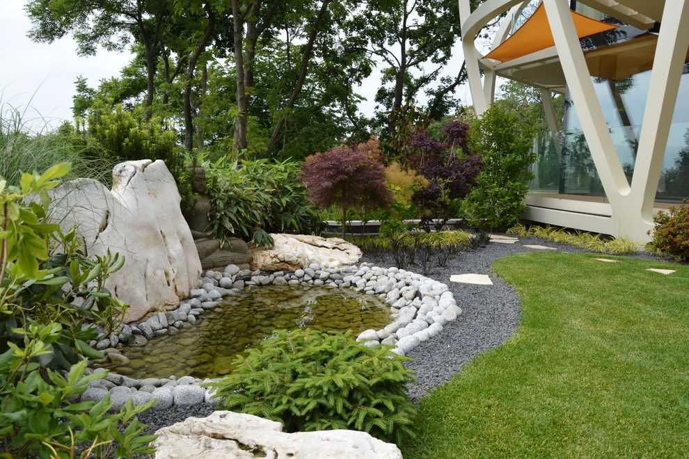- Часто в саду можно увидеть пруд, оформленный в таком же стиле. Береза пруда декорируют камнем и высаживают многолетние травянистые растения. В середине пруда можно сделать каменную гору, увенчанную водопадом или декоративной статуей.
