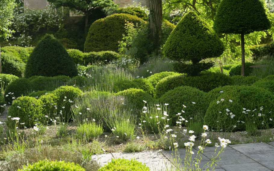 - использование фигурной и стриженой растительности, которая соседствует с вольно растущими зелеными насаждениями;