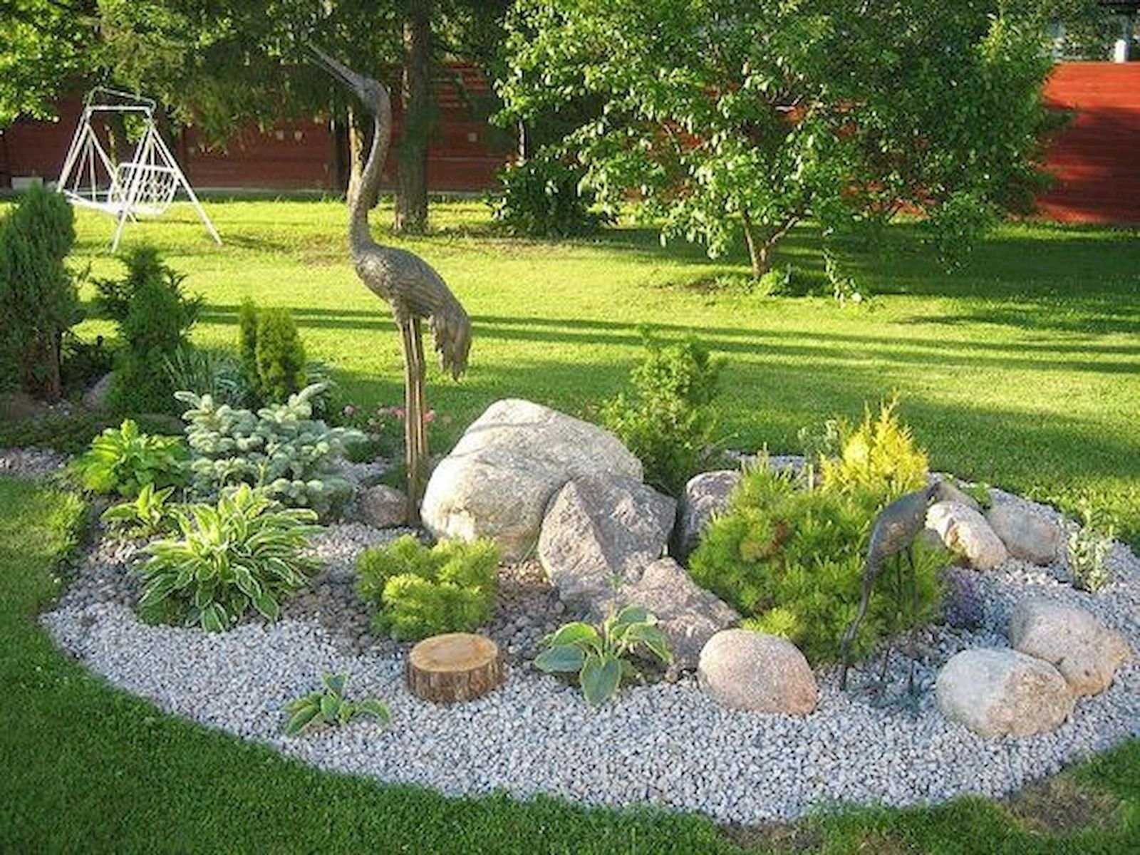Чтобы образ получился более выразительным, разместите по всему периметру садовые фигуры или необычные коряги.