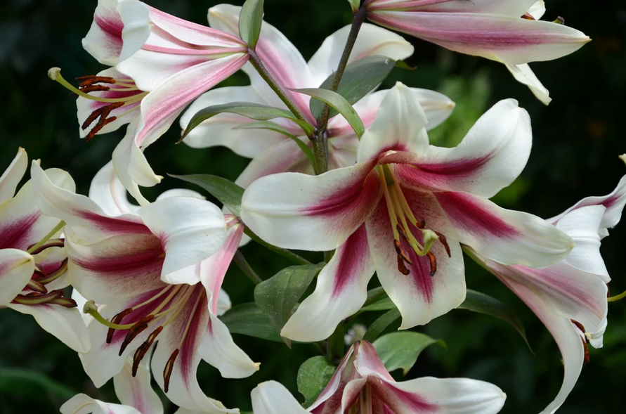 Представители этого сорта среднерослые (90-100 см). Крупные цветки двухцветные (белые в центре и с ярко-розовыми или малиновыми кончиками), без крапа, расположены в соцветиях по 3-5 штук. Отличительной особенностью этого сорта являются крупные луковицы.