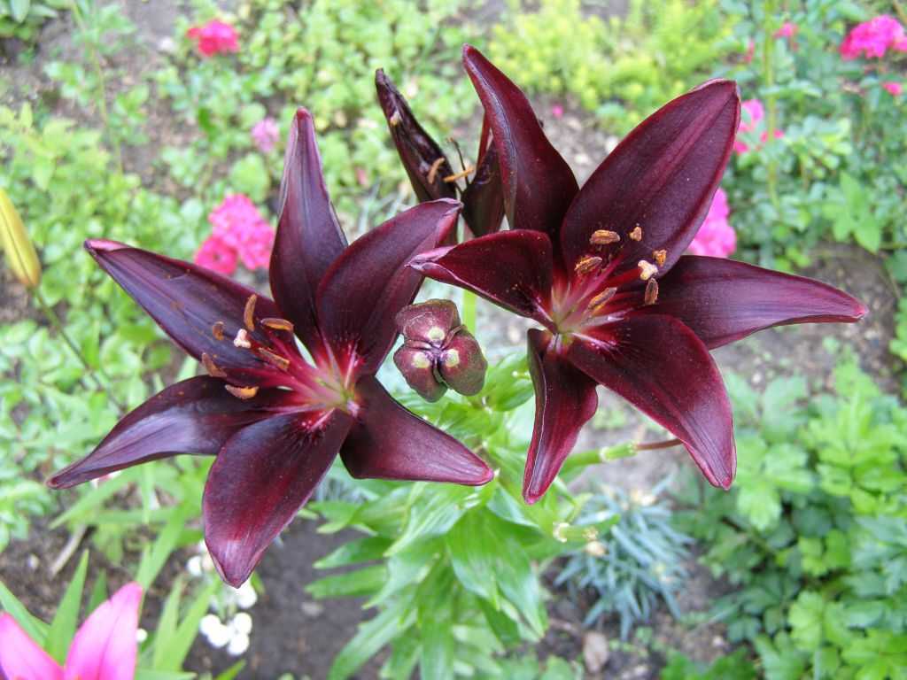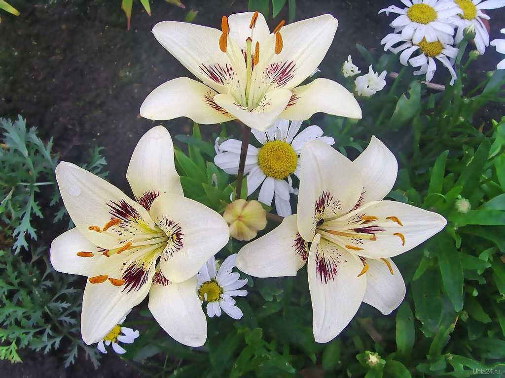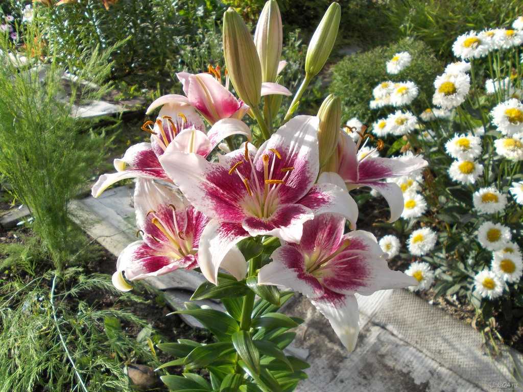 С ирисами лилии не сочетаются, поскольку первые быстро отцветают, теряя декоративность, и не нуждаются в поливе, который просто необходим растущим лилиям.