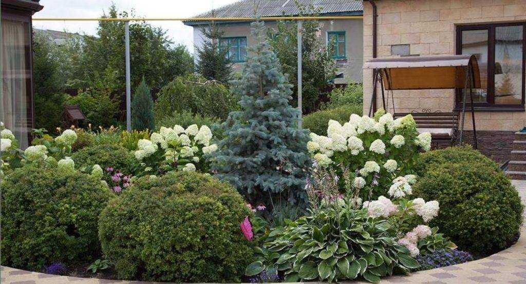 - постоянная зелень — такие цветники радуют взор хозяина участка в течение всего сезона;