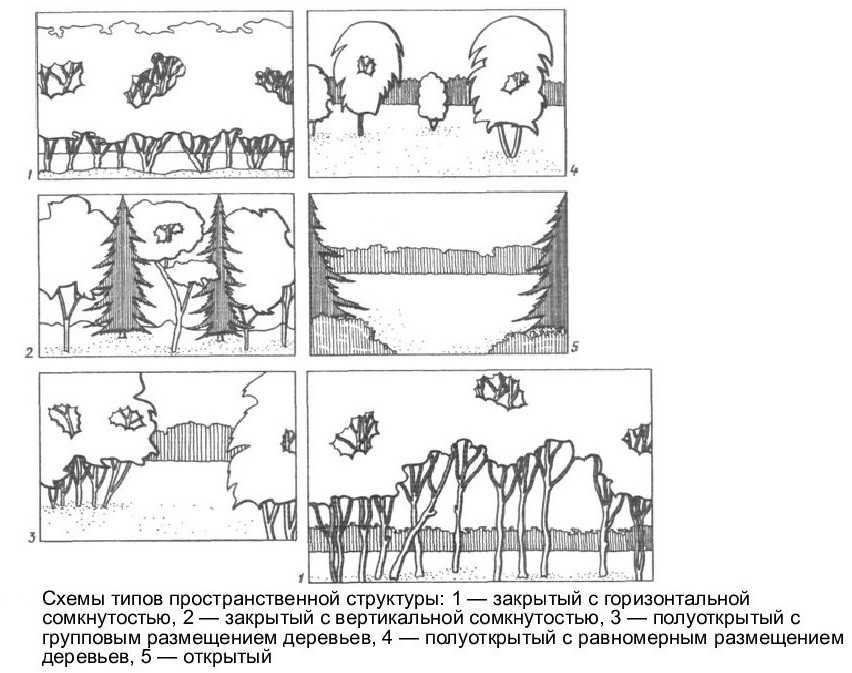- Закрытый (с горизонтальной или вертикальной сомкнутостью). Участок заполнен высокими или низкими деревьями частой посадки, лесная растительность;