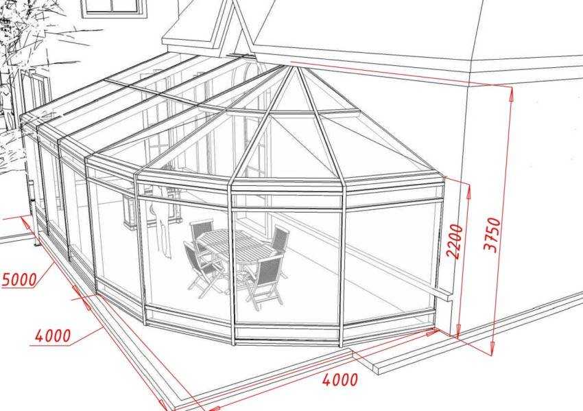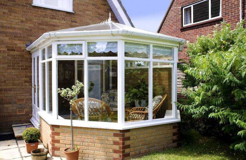 Основа конструкции — это каркас (рама), в который вставляются светопропускающие элементы из стекла или поликарбоната. Располагается такая конструкция на ленточном бетонном фундаменте.