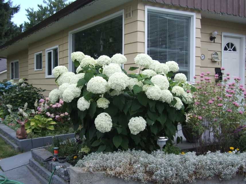 Особенность древовидной гортензии — способность цвести в кружевной тени деревьев и создавать цветущий уголок в саду. При обустройстве территории в природном стиле хорошими соседями гортензии станут роскошные кусты барбариса, спиреи, сирени, чубушника.