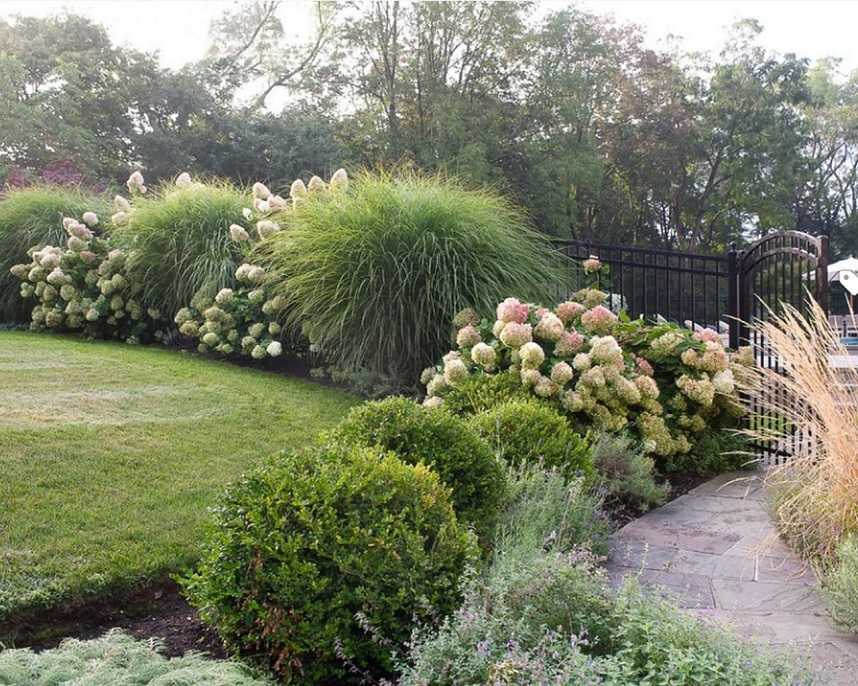 Рослые кусты будут возвышаться над гортензией и эффектно дополнять друг друга.