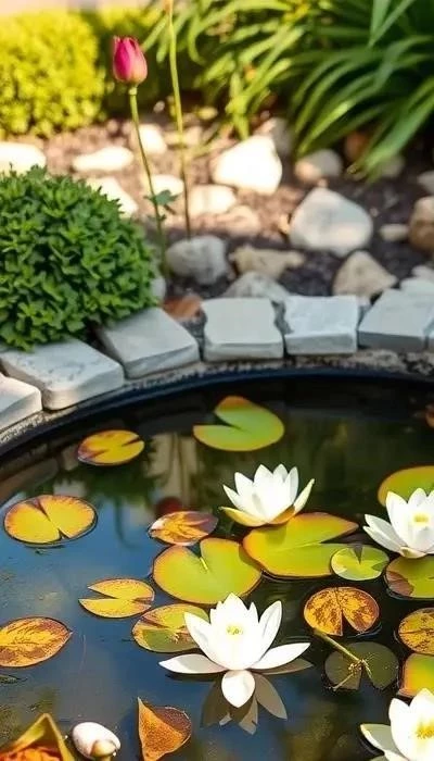 - Водоемы: Пруды, ручьи или фонтаны добавляют саду живописности и привлекают птиц и насекомых.
