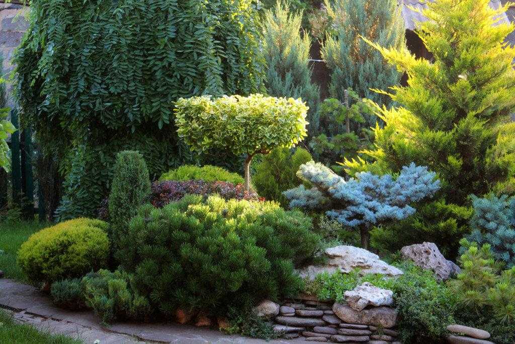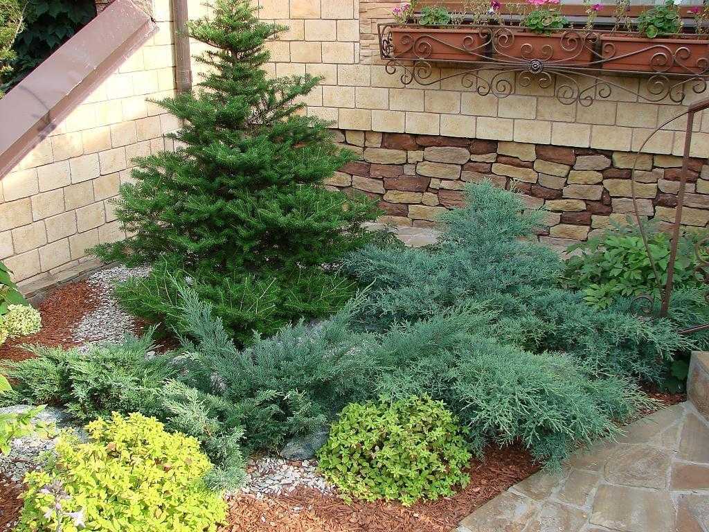 Деревья возле можжевельников могут расти разные, однако акцент следует делать именно на форму и структуру кроны выбранных насаждений. Разный окрас хвои также поможет сыграть на контрастах. Можжевельник может быть золотым, серебристым, голубым и зеленым. Если размеры двора позволяют, то высаживаются и другие хвойные: туи, пихты, тсуги, сосны, ели. Низкорастущие кусты способны выполнять функцию живой изгороди, позволяя незаметно разграничить имеющееся пространство. Стелющиеся формы выглядят потрясающе. Некоторые сорта могут использоваться как альтернатива газонному покрытию.