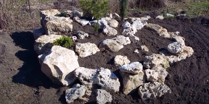 Для прочности конструкции большие камни пересыпают землей. Камни должны быть одной породы. Симметрия при укладке камней погубит внешний вид альпийской горки, они должны смотреться максимально естественно.