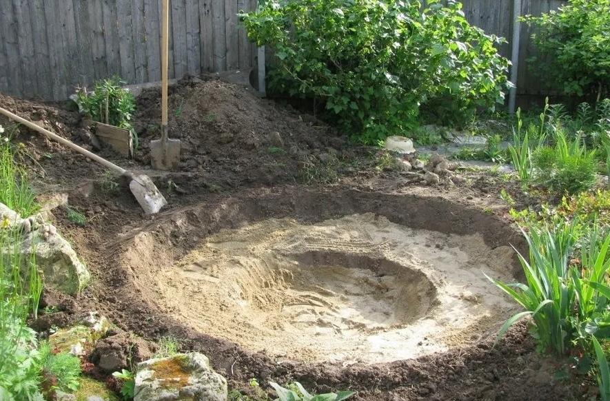 Следующий этап – очистка территории от мусора, копание котлована. Яма должна быть не более 40-50 см. также стоит убирать попадающиеся корни и сорняки, чтобы препятствовать их дальнейшему прорастанию. При обнаружении в выбранном месте глиняной почвы, суглинков, тогда стоит дополнительно устроить дренаж.