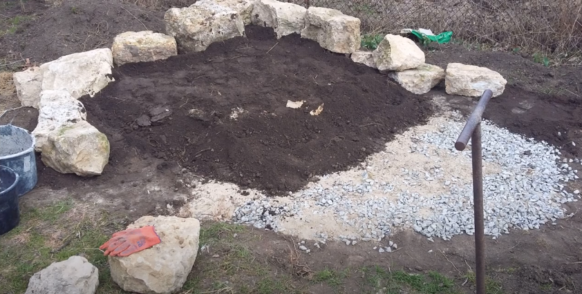 Следующим этапом работ будет устройство дренажа. Оно заключается в засыпке вашего будущего альпинария слоем мелкой крошки или гравия, и вообще, любым мелким камнем.