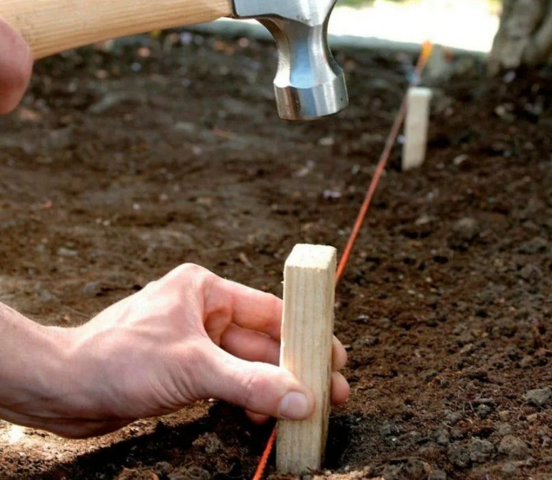 Когда выбрана локация, схема была разработана, тогда потребуется делать отметки. Помогут колышки и шпагат. Их нужно натянуть, чтобы обозначить границы. Можно использовать для этого известь, которую стоит рассыпать по периметру.