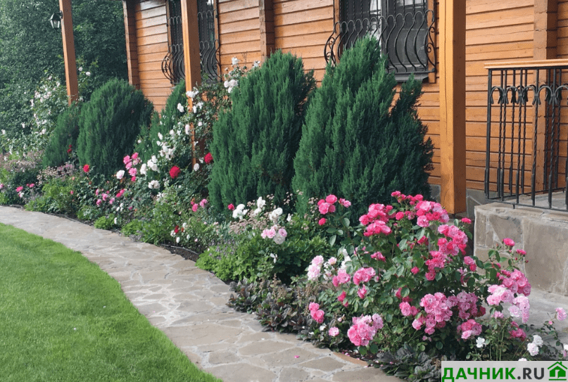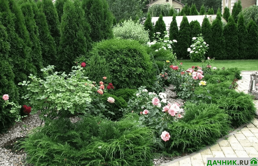Особое место в ландшафтном дизайне занимают хвойные растения и розы. Это смотрится эффектно, но нельзя забывать, что розы могут погибнуть из-за сильного защелачивания почвы.