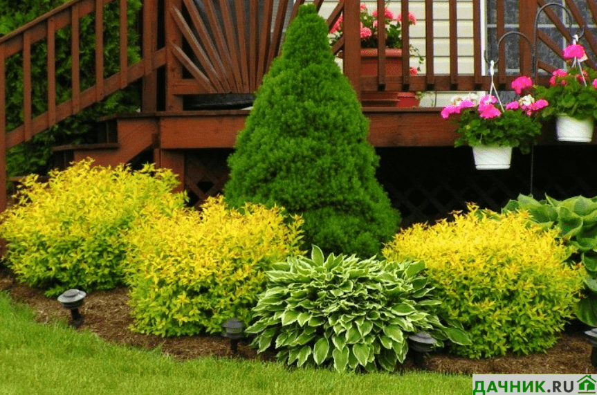 При создании в саду идеального ландшафта хорошими спутниками кустов и деревьев с хвоей станут хосты, не уступающие им по цветовой палитре. Очень эффектно, к примеру, смотрятся хосты с жёлтой листвой и туи с жёлтыми хвоинками.