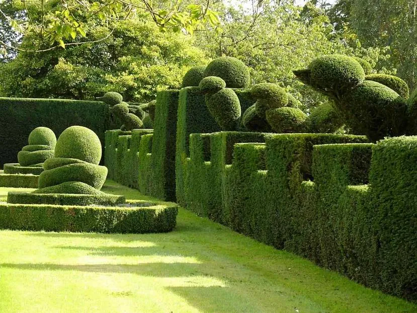 Садовники обрезают крону, боковые ветки, немного ограничивая их рост. Из туи можно создавать удивительные садовые скульптуры животных, сказочных персонажей, геометрические фигуры, целые композиции.
