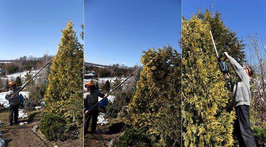 При обрезке рекомендуется периодически отходить от дерева, чтобы лучше видеть, где еще нужно укоротить ветки. Верхушка обрезается не полностью. При необходимости в течение лета проводится корректирующая стрижка.