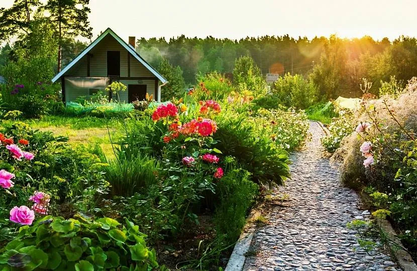Вокруг дома, беседок и террас устраиваются цветники с углубленными схемами размещений растений. Завершающим элементом в композиции из насаждений будет дорожка из гравия.