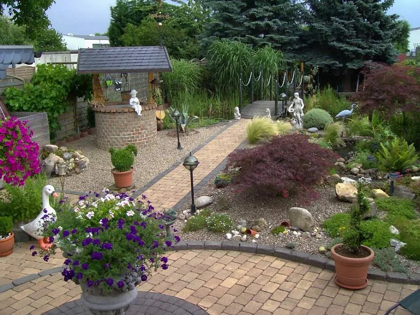 Гальку, песок, щебенку придется периодически подсыпать. Небольшой уклон по краям дорожек не даст воде скапливаться на них во время дождя.