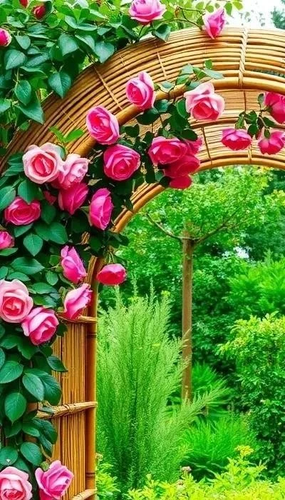 - Плетеные арки и перголы: Идеальны для поддержки вьющихся растений, создания тенистых уголков и романтической атмосферы.