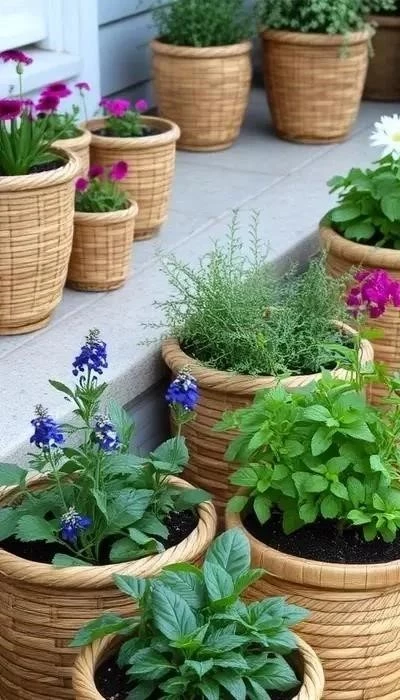 - Плетеные вазоны: Экологичная альтернатива пластиковым горшкам, придающая саду естественный вид.