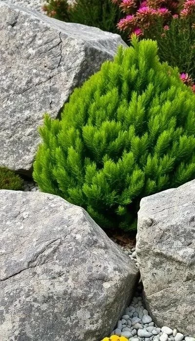 - Хвойные: Карликовые сосны, можжевельники, туи – придают рокарию структуру и объем.