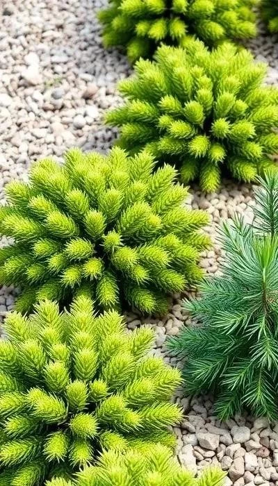 - Композиции: Сочетайте хвойные растения разных видов и форм для создания гармоничных композиций.