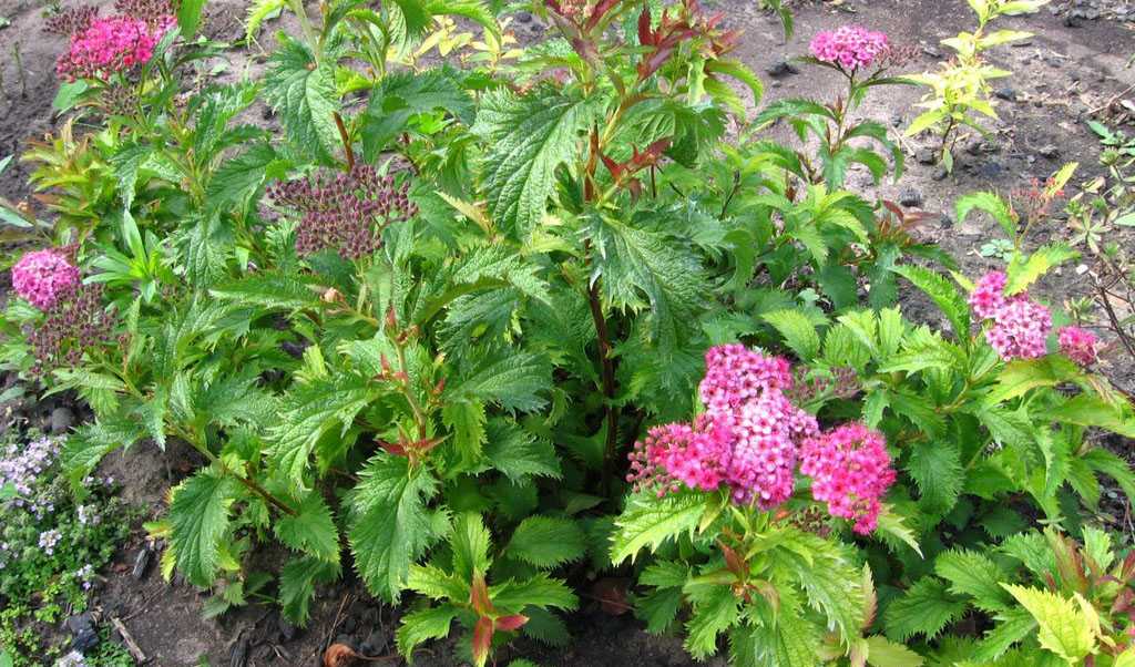 Скрещенный вид японской и белоцветковой спиреи. Высота кустика – до 80 см. Окраска от розоватого до насыщенно-красного.